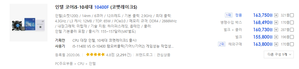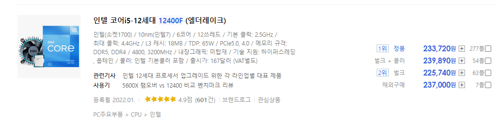 163,750(10400F, 정품) vs 233,720(12400F, 정품)