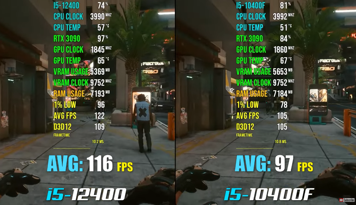 싸이버펑크 2077 높음 FHD으로 각 평균 프레임은 116, 97로 인텔 i5-12400F가 인텔 i5-10400F 비해 약 18% 우세한 게임 성능을 보여주었습니다.