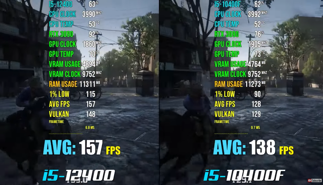레드 데드 리뎀션 2 높음 FHD 기준으로 각 평균 프레임은 157, 138로 인텔 i5-12400F가 인텔 i5-10400F에 비해 약 14% 우세한 게임 성능을 보여주었습니다.