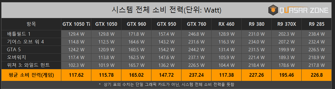 GTX 1050 Ti의 소비전력은 117W, GTX 1050의 소비전력은 115W, GTX 960의 소비전력은 165W로 정격 300W만 있어도 충분한 모습을 보여주었습니다.
