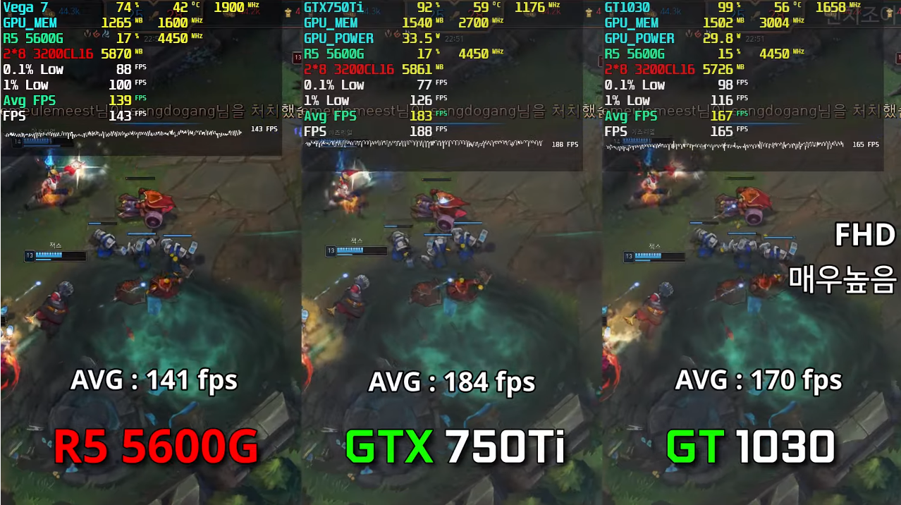리그 오브 레전드 매우 높음 FHD 기준으로 각 평균 프레임은 141, 184, 170으로 GTX750Ti가 라이젠 5600G보다 약 35%, GT 1030이 라이젠 5600G보다 약 22% 우세한 성능을 보여주었습니다.
