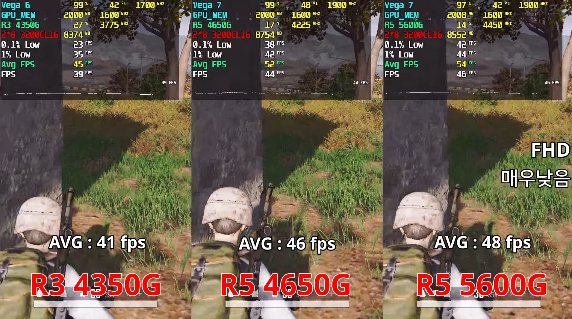 배틀그라운드 매우 낮음 FHD 기준으로 각 평균 프레임은 41, 46, 48로 라이젠 5600G가 라이젠 4650G보다 약 3%, 라이젠 4650G이 라이젠 4350G보다 약 10% 우세한 성능을 보여주었습니다.