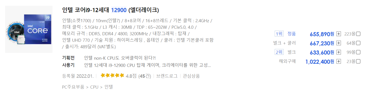 둘 모델 간의 가격 차이는 2022.06.26을 정품을 기준으로 인텔 i9-12900가 약 8천원 더 비싸기 때문에 인텔 i9-12900F를 선택할 이유는 없어 보입니다.