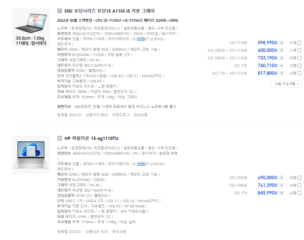 약 60만원 (i5-1155g7) vs 약 45만원 (R5 5500U)