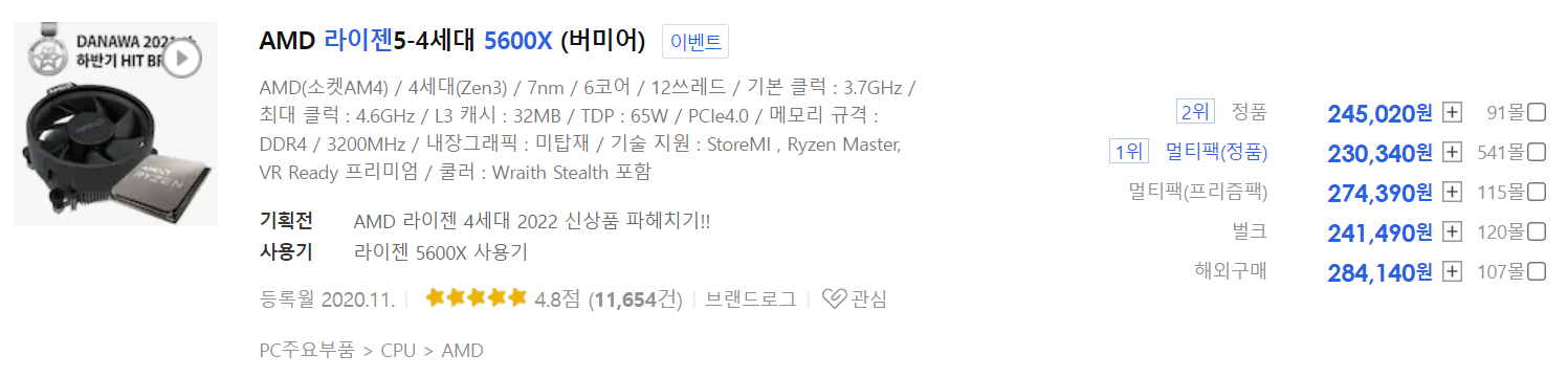 라이젠 5600X로도 충분한 게임 성능을 보장할 수 있으며, 가격은 20만원 초중반대를 유지하고 있기 때문에 여유가 많은 분이 아니시라면 라이젠 5600X를 선택하는 것이 현명해 보이네요.