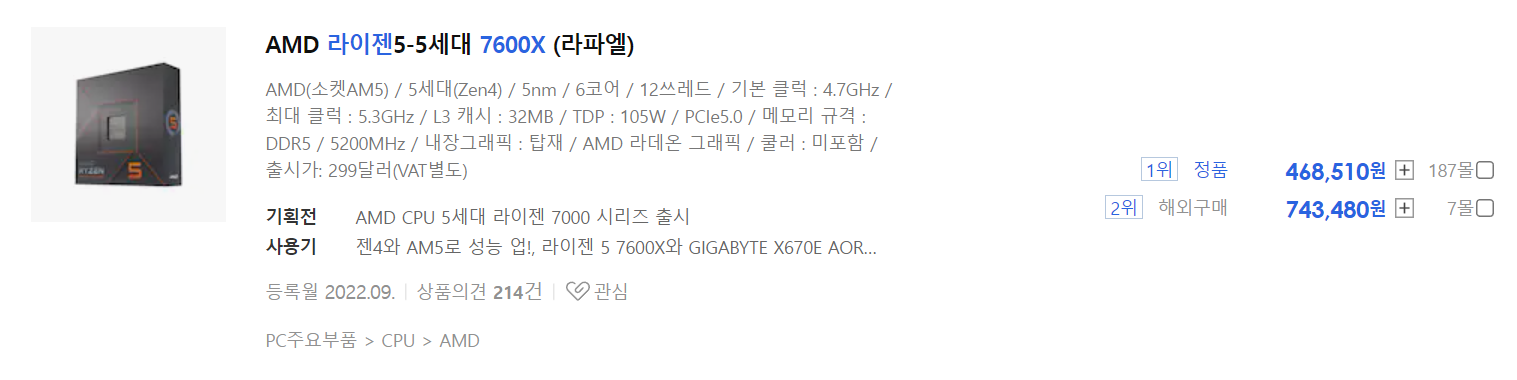 2022.10.12 기준으로 가격 차이가 라이젠 7600X가 약 23만원 정도 더 비싼 것을 알 수 있습니다.
