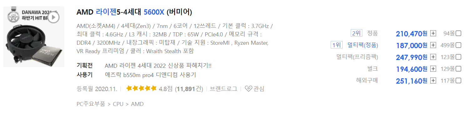421,400(13600K, 정품) vs 187,000(5600X, 멀티팩)