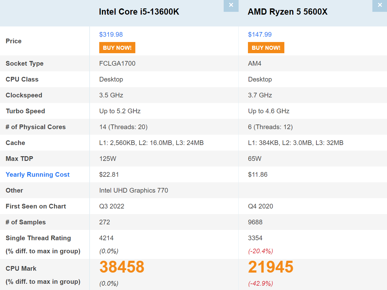 그렇다면 인텔 i5-13600K와 라이젠 5600X의 성능 차이는 얼마나 날까요?