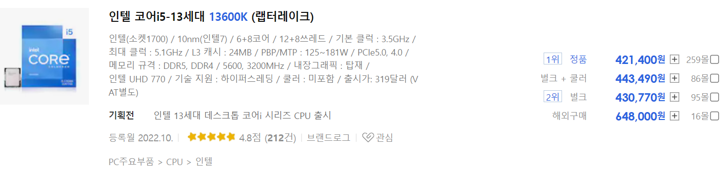 라이젠 5600X는 출시된 지 약 2년이 되었기 때문에 물량 안정화가 많이 되었고, 인텔 i5-13600K는 아직 출시가 얼마 안 되었기 때문에 가격 차이가 많이 벌어진 것 같네요.