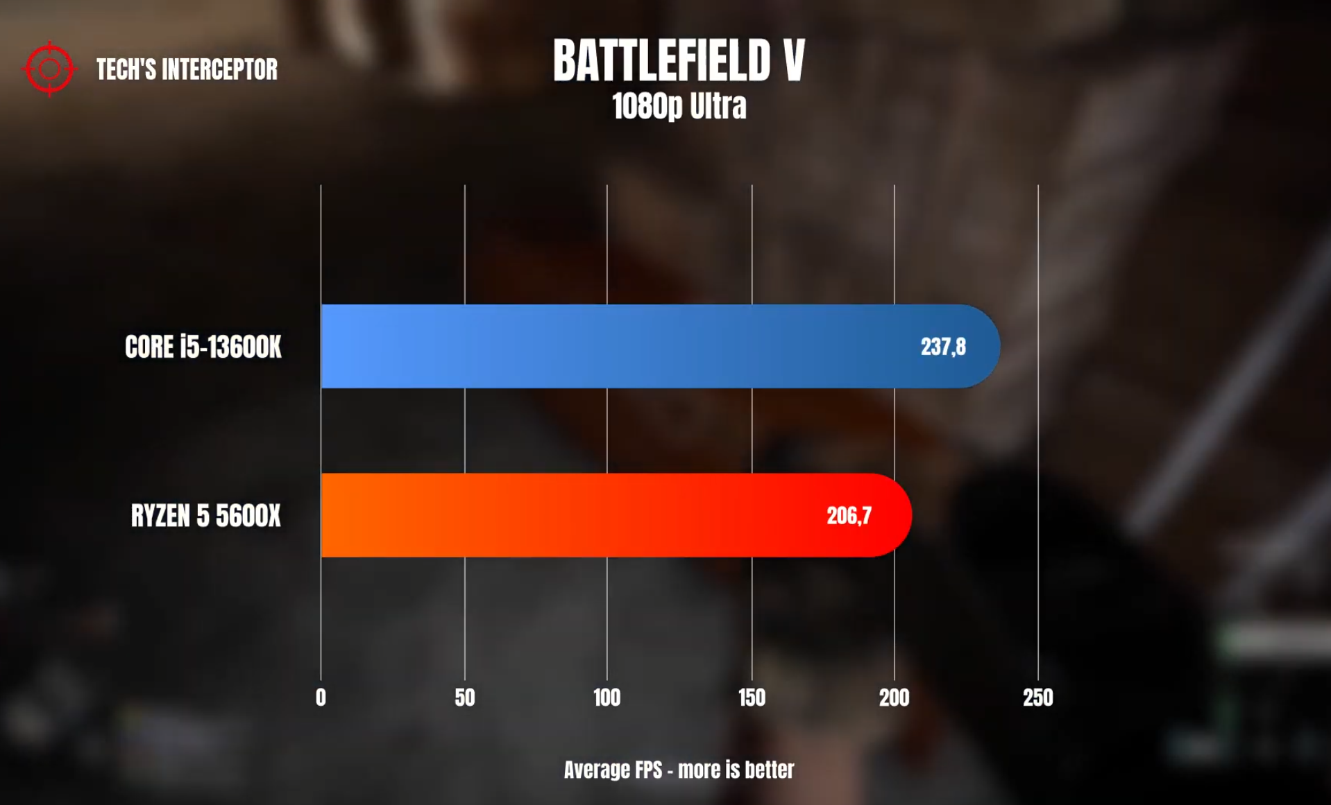 배틀필드 5 울트라 FHD 기준으로 각 평균 프레임은 237, 206으로 인텔 i5-13600K와 라이젠 5600X 비해 약 15% 우세한 성능을 보여주었습니다.