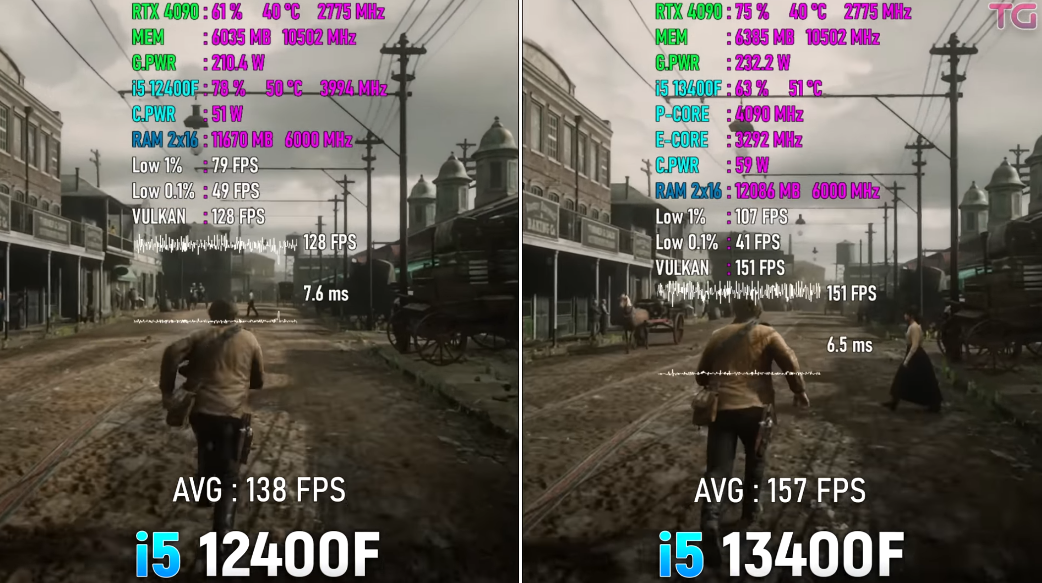 레드 데드 리뎀션 2 FHD 울트라 기준으로 각 평균 프레임은 138, 157로 인텔 i5-13400F가 i5-12400F 비해 약 13% 우세한 게임 성능을 보여주었습니다.