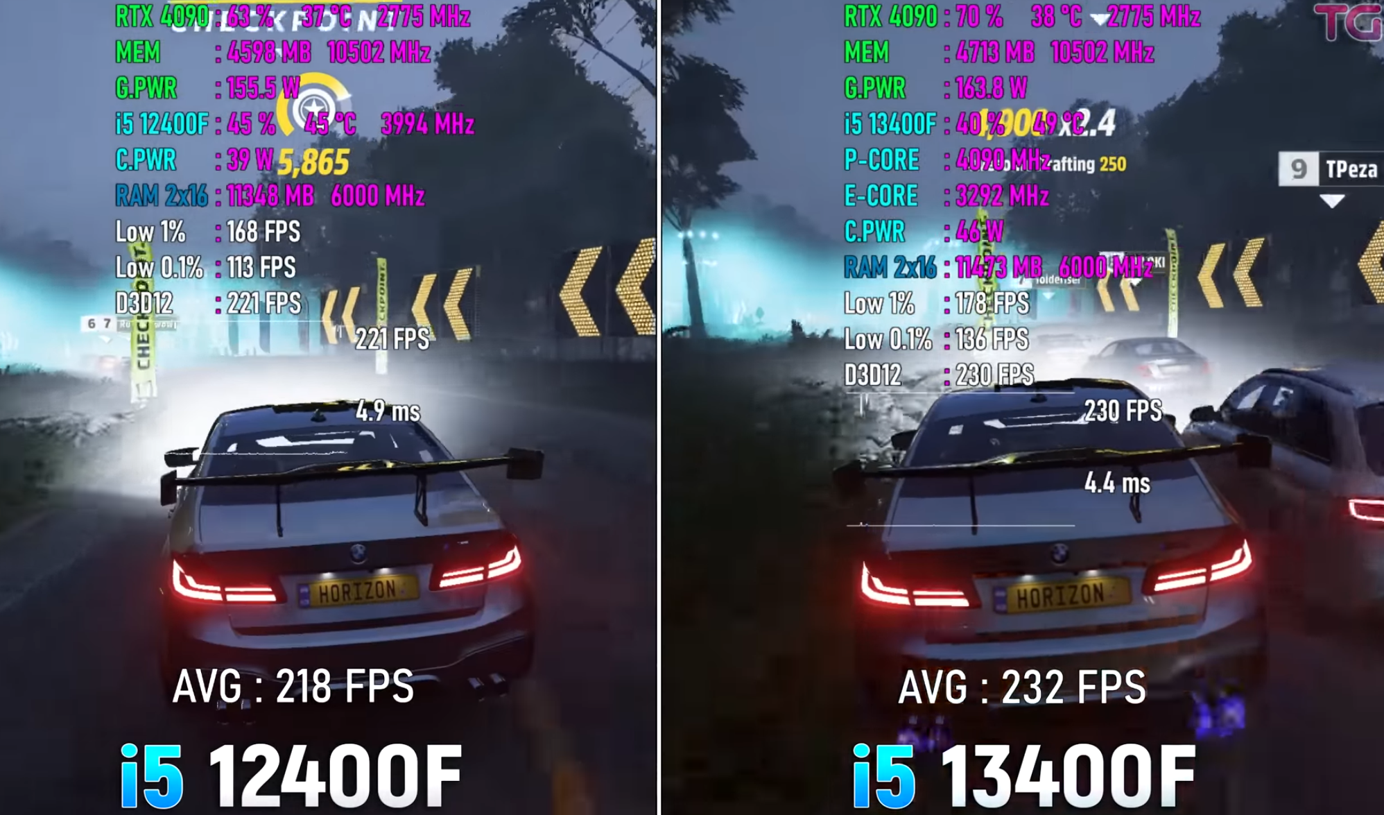 포르자 호라이즌 5 FHD 높음 기준으로 각 평균 프레임은 218, 232로 인텔 i5-13400F가 i5-12400F 비해 약 7% 우세한 게임 성능을 보여주었습니다.