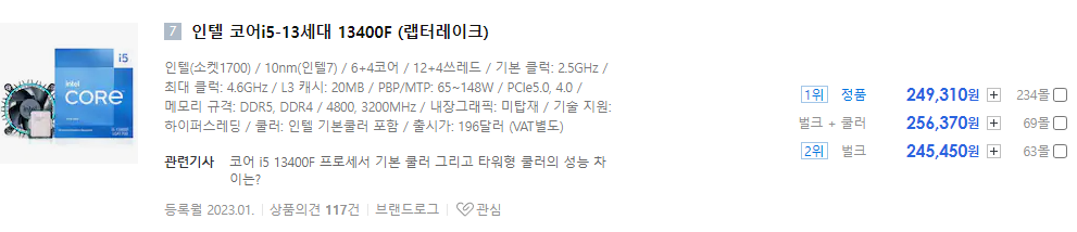 2023.01.22 기준으로 가격 차이가 인텔 i5-13400F가 약 5만원 정도 비싼 것을 알 수 있습니다.