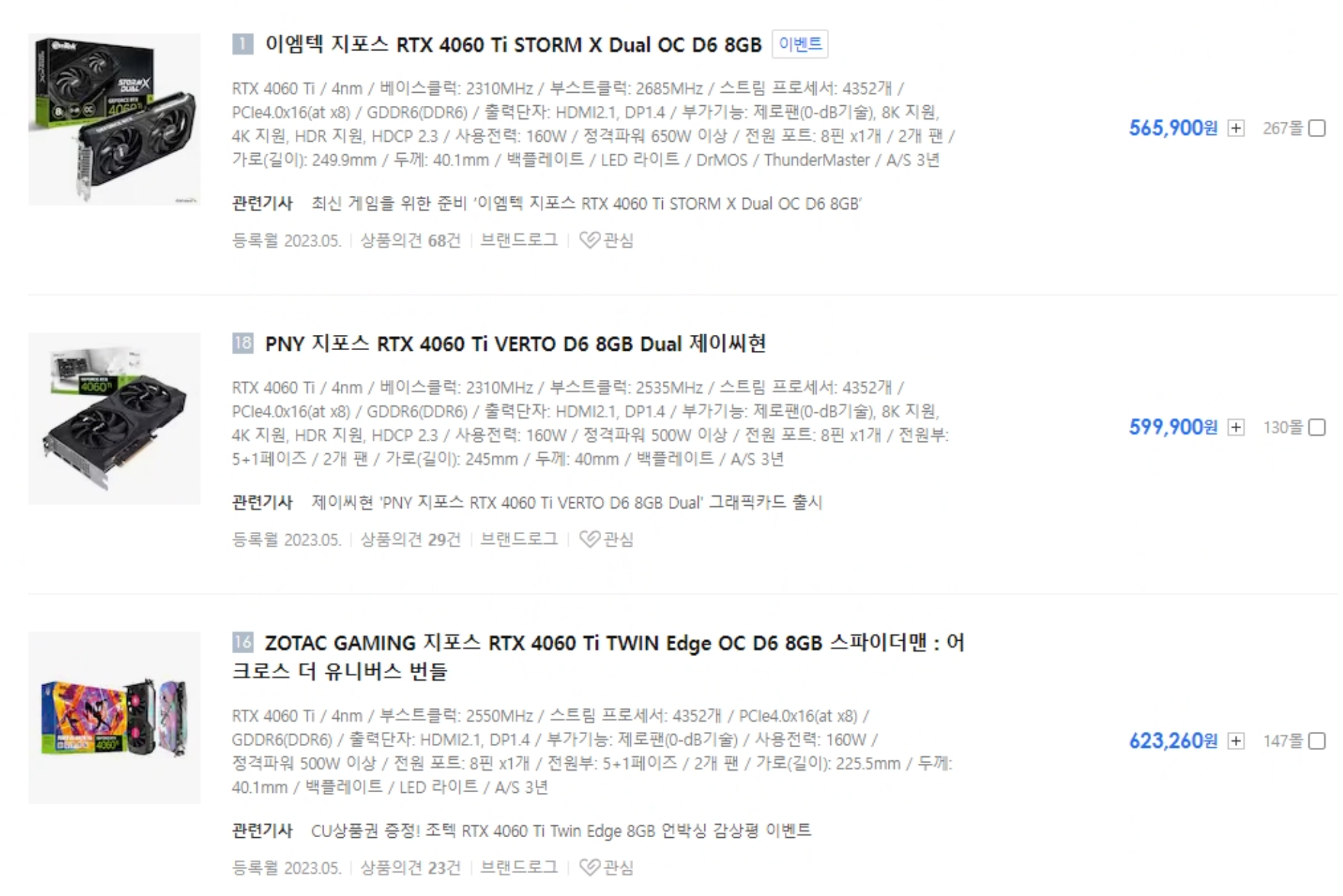 2023.06.24 기준으로 모델마다 상이하지만 다나와에서 상품의견 순으로 내렸을 때 Top 3을 기준으로 RTX 4070이 RTX 4060Ti에 비해 약 25만원 정도 비싼 것을 알 수 있습니다.