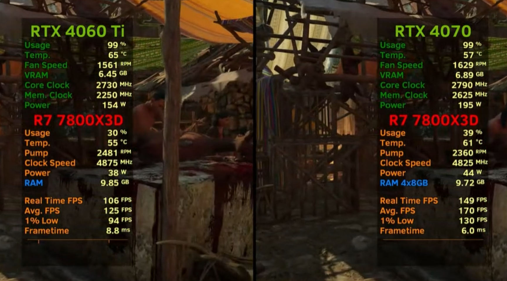 레지던트 이블 4 리메이크 QHD 높음에서 돌렸을 각 평균 프레임은 92, 130로 RTX 4070이 RTX 4060Ti보다 약 41% 우세한 성능을 보여주었습니다.