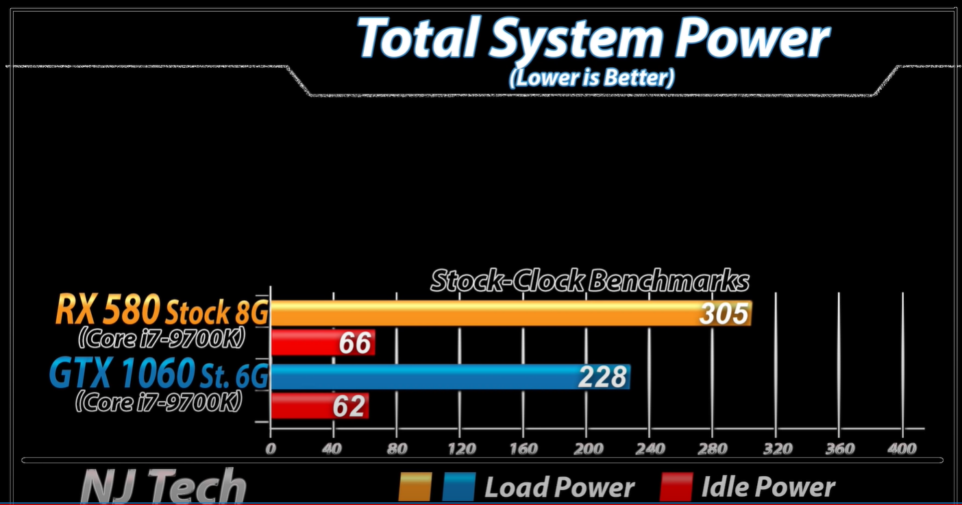 그렇지만 전성비 면에서는 GTX 1060 6GB가 압도하는 모습을 보여주고 있습니다. 풀 로드에서 실행할 시 약 70W를 차이나기 때문에 성능은 비슷하지만 발열 면에서는 GTX 1060 6GB가 더 잘 관리된다는 것을 보여주었습니다. 둘 다 300W 이내로 시스템 소비전력을 보여주기 때문에 정격 파워 500W로도 충분히 돌릴 수 있을 거라 생각이 됩니다.