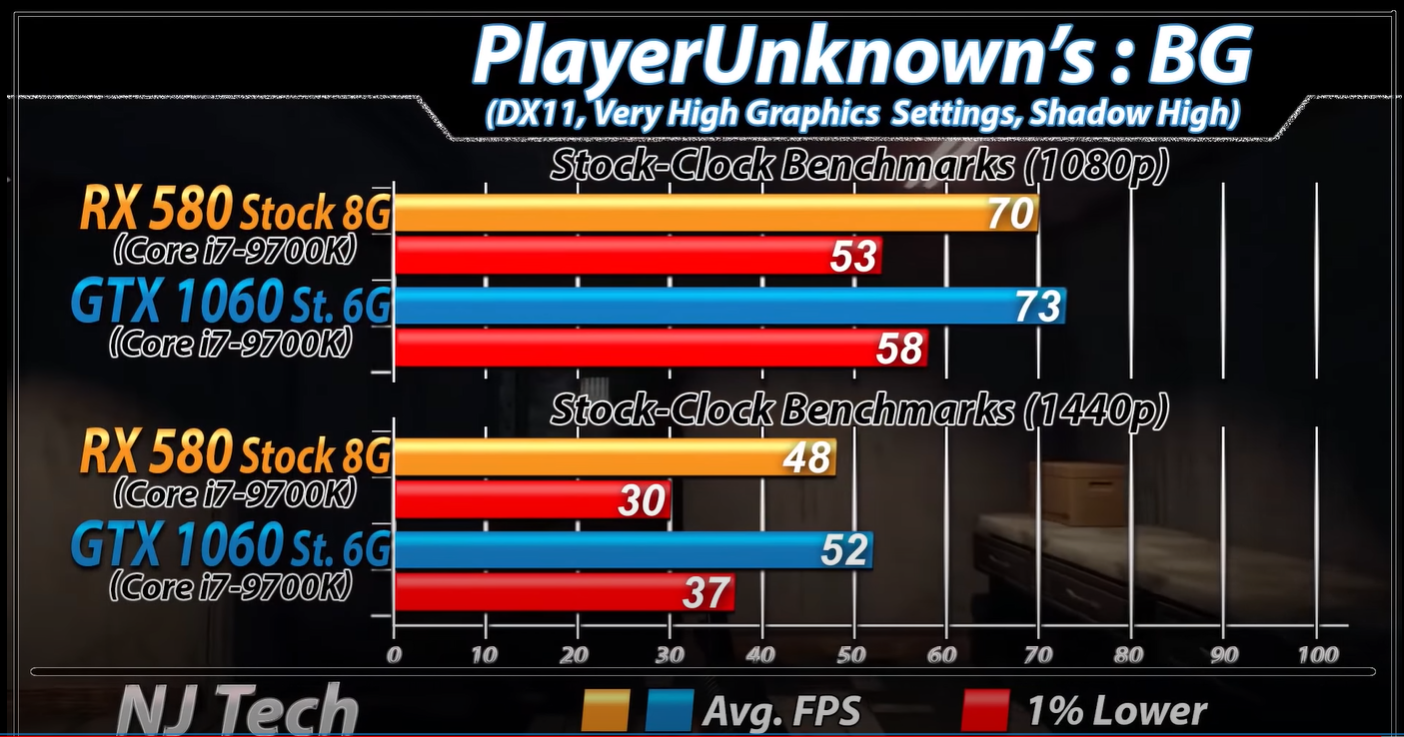 대체로 RX 580 8GB가 더 우세한 모습을 보여주고 있습니다. 배틀그라운드 같은 게임에서는 GTX 1060 6GB가 이기는 모습을 보여주고 있지만 대부분 게임에서는 GTX 1060 6GB가 밀리는 모습을 보여주고 있네요!