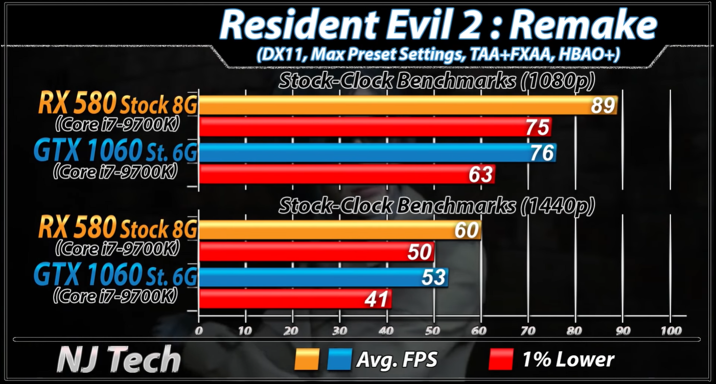 레지던트 이블 2 리메이크 및 레데리 벤치마크를 보시면 RX 580 8GB가 더 우세한 성능을 내는 것을 확인할 수 있습니다. 게임에 따라서 어디에 최적화에 있느냐에 따라 게임에 따라 차이가 있는 것을 확인할 수 있습니다.