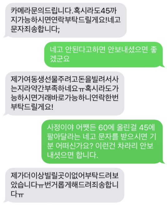 그대로 적용해 본다면 구매자가 무리한 요구, 예를 들어 5만 원 네고가 가능한 이 같은 요구에도 흔쾌히 수용하거나 인증 글을 요청하지도 않았는데도 자기의 개인정보가 담겨있는 사업등록증이나 신분증을 보내주는 행동을 하게 됩니다. 이는 판매자 입장에서 하기 귀찮고 불쾌한 일인데 굳이 한다는 것을 생각해보면 구매자를 안심시켜 어떻게든 돈을 송금시키기 위한 행동으로 생각하시면 될 듯합니다. 택배비 네고나, 만 원 정도 네고는 괜찮다고 생각하지만 위 같은 무리한 요구를 다 받아주는 판매자는 의심해 볼 필요가 있습니다.