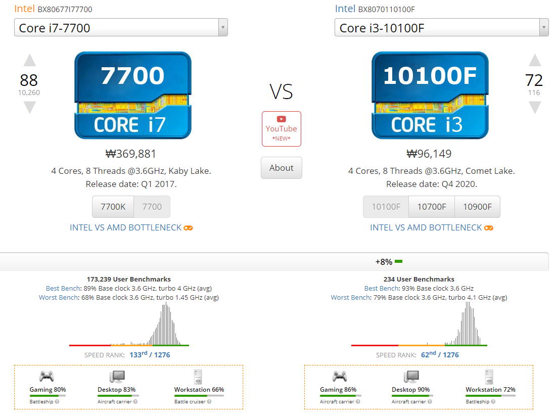 해당 스펙으로 보면 i7-7700의 성능과 비슷한데 오히려 종합적인 성능이 8퍼 더 좋은 게 보이시나요..?? 심지어 가격은 10만 원도 안 하는데 7세대의 i7 cpu를 10세대의 i3 하급 모델이 이겨버리는 아이러니한 상황이 생겨버렸습니다.