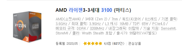 그렇다면 AMD는 i3-10100F에 대항하는 모델이 어떤 것이 있을까요? 라이젠 3100입니다!