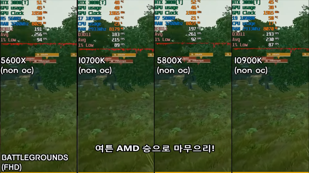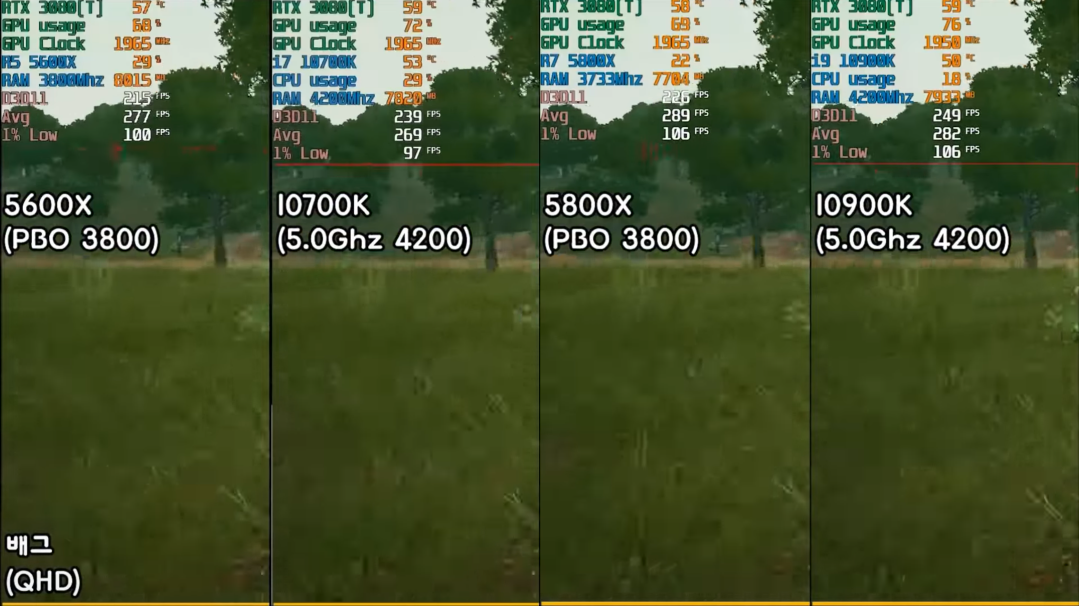 배틀그라운드에서 논오버로 게임을 진행할 시, 라이젠 5600x가 인텔 i9-10900k와 비슷한 성능을 내주었습니다. 오버시에는 10900k가 5600x를 이기는 모습을 보여주고 5800x와 비슷한 성능을 내주게 되는데 확실히 배그에서도 역시 라이젠 zen3가 출중한 성능을 내는 것을 확인할 수 있습니다.