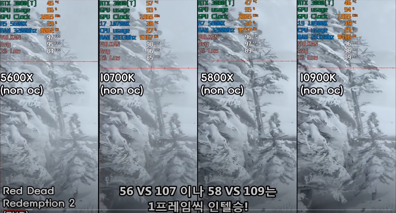 해당 영상은 RTX3080을 기준으로 한 것이라고 생각하시면 될 듯 합니다. 레데리 같은 고사양 게임은 그래픽카드 요구 사항이 많아 5600x나 5800x, 10700k에서도 서로 비슷한 면목을 보실 수 있습니다. 그렇다면 고사양 게임에서는 서로 차이가 없다는 것인데 CPU를 많이 타는 게임이라면 어떨까요..??