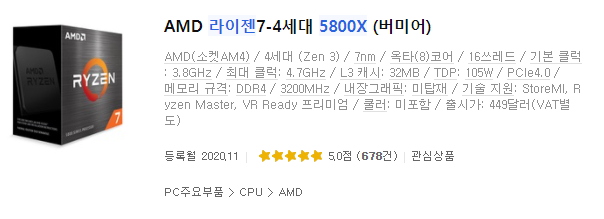 라이젠 5600x보다 2코어 갯수를 더 가진 라이젠 5800x 입니다! 라이젠 5700x는 내년에 나올 것으로 확인된다는데요, 2코어 차이지만 밑에 라이젠 5600x와 가격차이가 150달러가 나는건 아무래도 비싼 감이 없지 않나 싶네요.