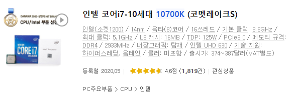 올해 5월 달에 출시한 i7-10700k!! 상급 게이밍 PC에서 빠질 수 없는 CPU이죠. 저도 10700k로 맞출까 많이 생각해 보았는데 이번에 zen3가 곧 출시한다는 소식을 듣고 나온 후에 결정하려고 생각했었습니다. 그런데 뚜껑을 열어보니..??