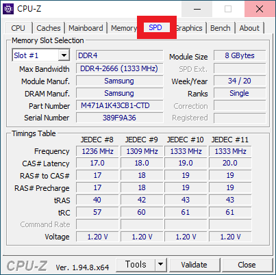SPD 탭에 들어가시면 각 슬롯에 꽂혀 있는 램의 자세한 정보를 알 수 있습니다.