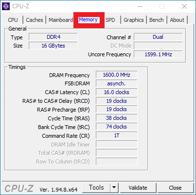 또한 메모리 탭을 눌르시면 저의 램의 Type이 DDR4, DDR3 둘 중 어떤 것인지 확인하실 수 있고 램 용량, 타이밍까지 알 수 있습니다. 램 타이밍은 오버클럭할 때 확인하는 부분이니 추후 오버클럭을 진행하신다고 하면 해당 정보를 확인하시면 됩니다.