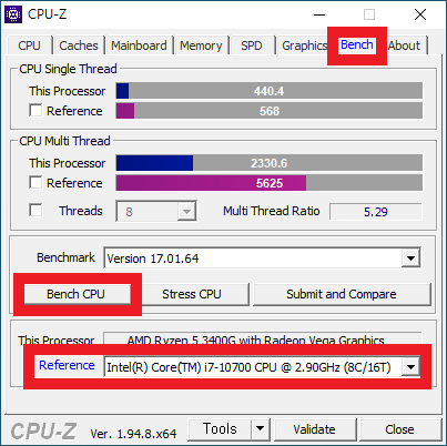 벤치 탭을 가보시면 Reference에 있는 CPU 한해서 CPU-Z만의 벤치마크를 통해 성능을 비교해 볼 수 있습니다!