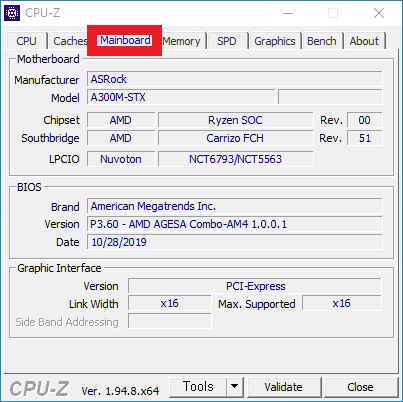 메인보드 탭에서는 메인보드의 모델과 BIOS의 버전 및 해당 바이오스 버전 날짜를 확인할 수 있습니다. 저의 메인보드 모델은 A300이며 2019년 10월 28일날 출시한 바이오스 버전을 사용하고 있네요!