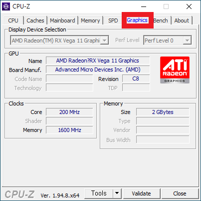 Graphics 탭으로 들어가시면 제가 사용하고 있는 그래픽카드를 확인하실 수 있습니다. 제가 쓰고 있는 그래픽카드는 Vega 11 그래픽이며, 라이젠 3400G가 내장 그래픽이 있는 APU이기 때문에 모델명이 저렇게 뜨는 것을 확인하실 수 있습니다.