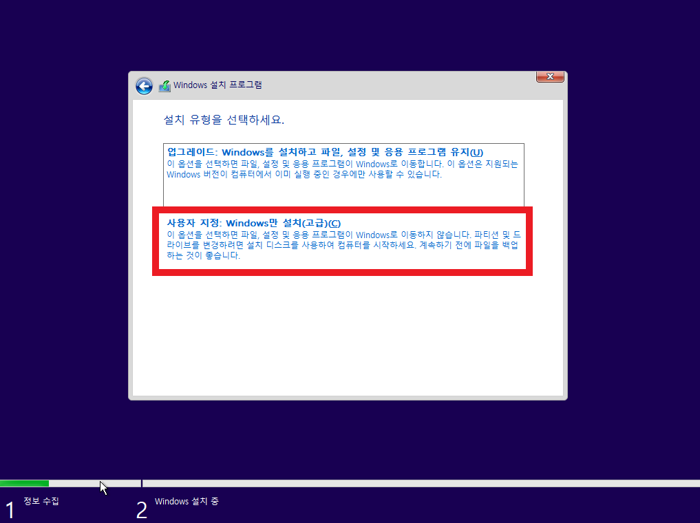 업그레이드를 클릭하시면 업그레이드 할 버전이 없다면서 처음으로 돌아가기 때문에 업그레이드를 클릭하지 마시고 사용자 지정 : Windows만 설치(고급)를 클릭해 주세요!