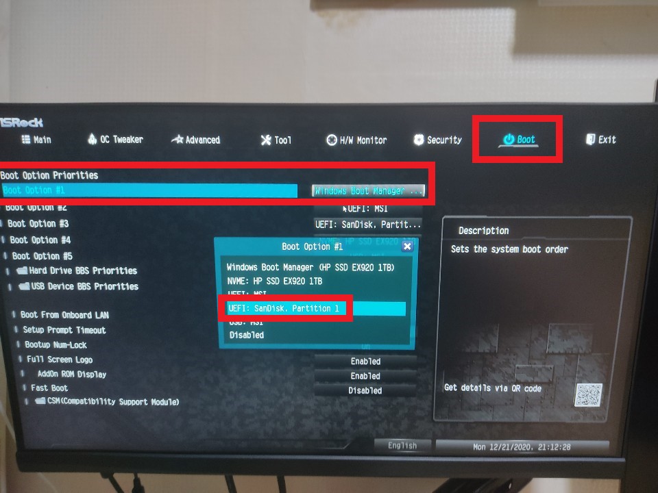 그다음에, 해당 USB를 클릭합니다. 저 같은 경우에는 Sandisk USB에 설치를 했기 때문에 UEFI: SanDisk Partition 1으로 뜨는 사진입니다.