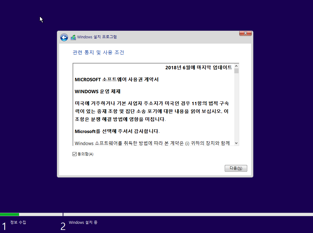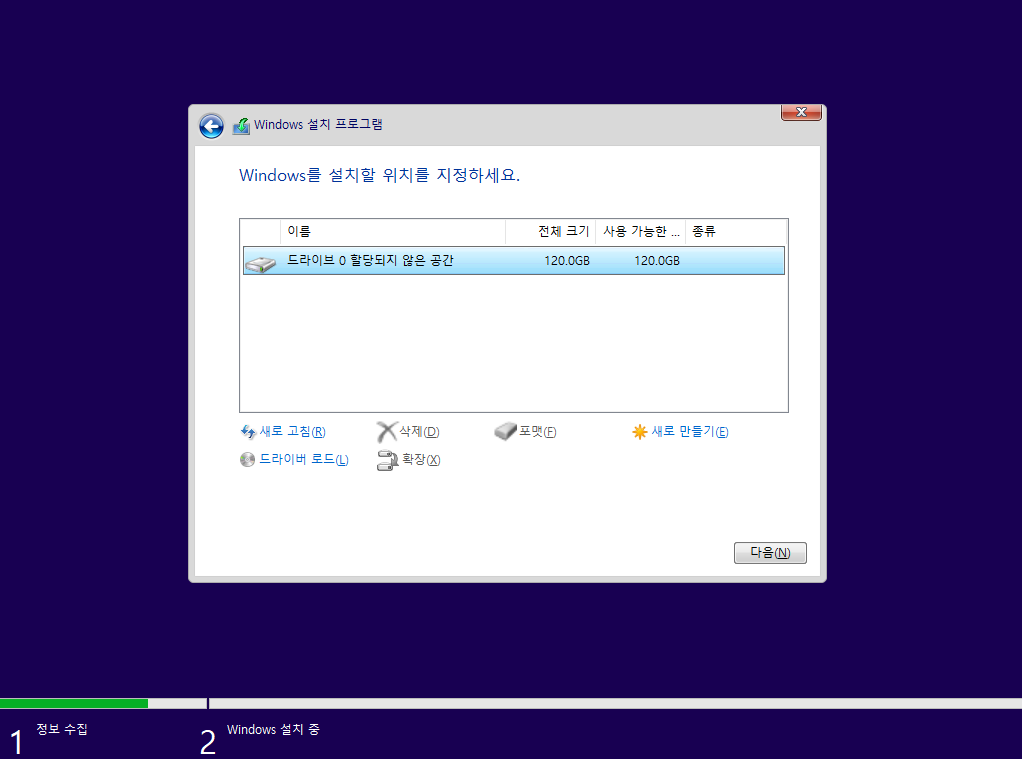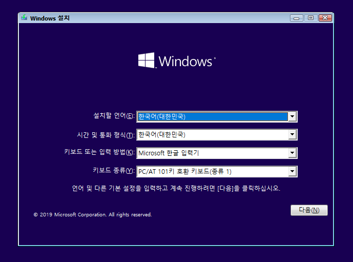 그렇게 제대로 부팅 순서가 잡혔다면 위 사진처럼 해당 화면이 뜰 겁니다! 위 설정대로 하시고 다음을 클릭합니다.