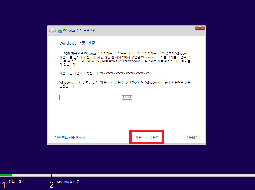 제품 키가 있으면 키를 입력하시면 되지만 키가 없으시다면 제품 키가 없음을 선택합니다.