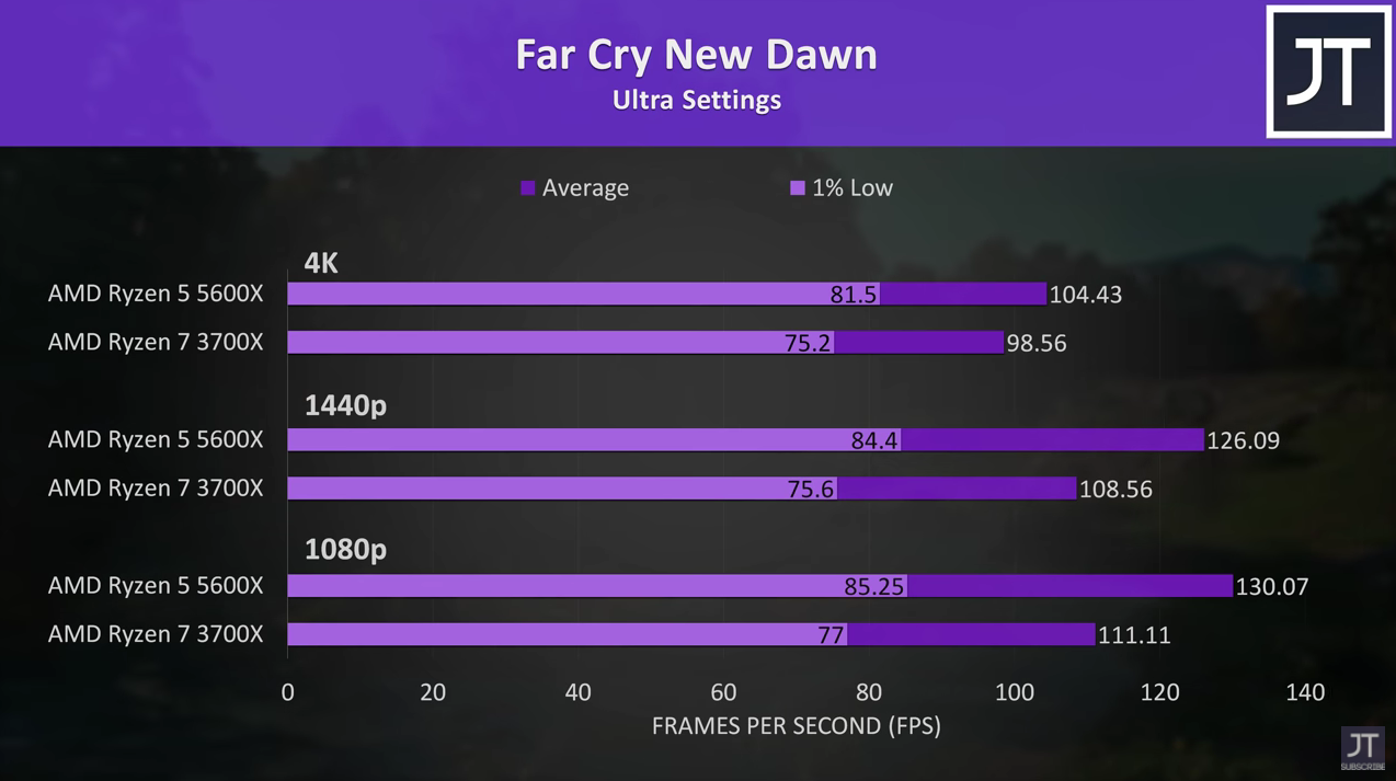 Far Cry에서는 라이젠 5600x가 더 좋게 나오는 것을 확인할 수 있습니다. 이로써 다코어를 사용하지 않는 게임이면 라이젠 5600x가 더 우세한 것을 확인할 수 있습니다.