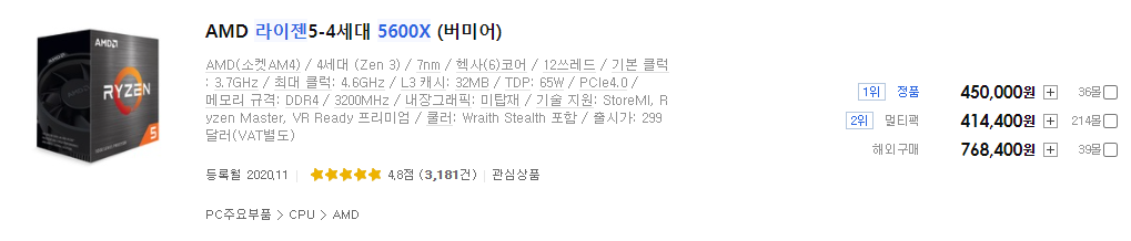그러나, 현재 2020년 12월 22일 부로 재고가 들어오고 있다고 하여 가격이 점차 안정화되고 있으니 조금만 더 기다렸다가 라이젠 5600x을 구입하시면 되겠습니다!