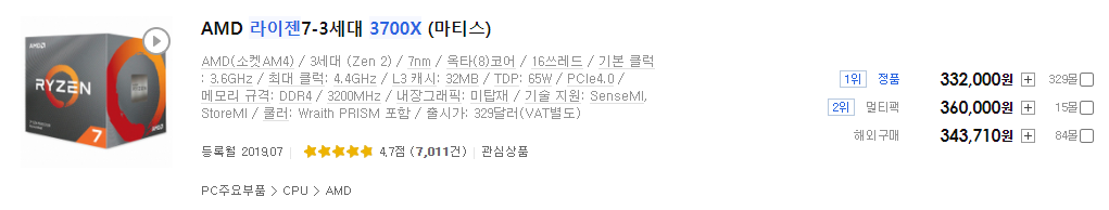 많은 커뮤니티나 유투버들에게 작업 및 게이밍 용도로 가성비 1위를 추천받았던 라이젠 3700x입니다. 8코어 16쓰레드 임에도 불구하고 경쟁사인 인텔의 i7-10700k랑 성능이 비슷하면서 가격이 낮았기 때문에 선택을 받을 수 있었죠.