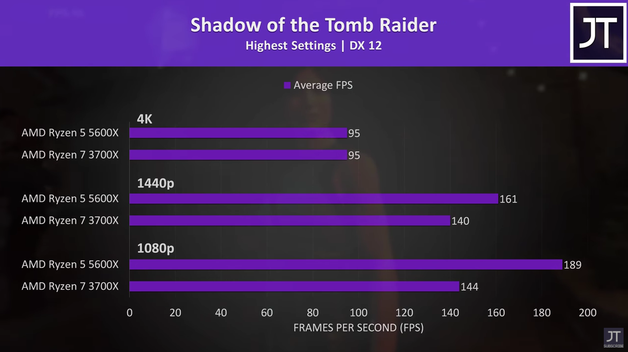 쉐도우 오브 더 툼레이더에서 비교를 하였을 때, FHD에서 라이젠 5600x가 라이젠 3700x에 비해 높은 프레임을 뽑는 것을 확인할 수 있습니다. 대략 FHD기준으로 30% 정도 차이가 나는 것이 보여주고 있네요.