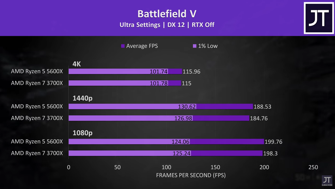 배틀필드에서는 차이가 거의 나지 않는 것을 확인하실 수 있습니다. 싱글 코어 성능이 더 높은 라이젠 5600x이지만 해당 게임은 8코어까지 고르게 사용하는 게임이기 때문에 큰 차이가 나지 않네요!