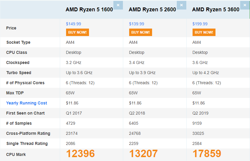 CPU Mark 점수를 보시면 라이젠 1600 -> 라이젠 2600은 8퍼 정도 증가한 것을 반면, 라이젠 2600 -> 라이젠 3600은 20퍼 이상 증가한 것을 확인할 수 있습니다.