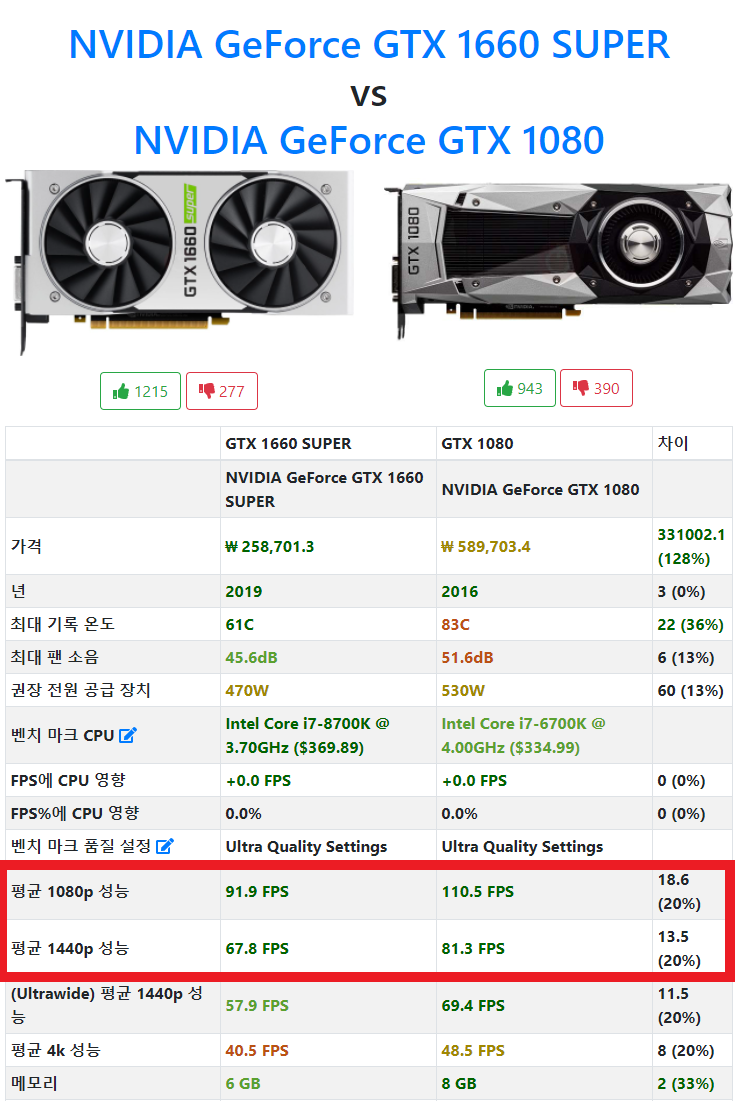 또한, GTX 1660의 반응이 좋지 않자 황 회장은 거의 똑같은 가격에 더 좋은 GTX 1660 Super를 출시하면서 황 통수 스킬을 시전 하였죠. 그렇다면 GTX 1660 Super와 파스칼 시대의 80번 라인인 GTX 1080의 성능은 얼마나 차이가 날까요?