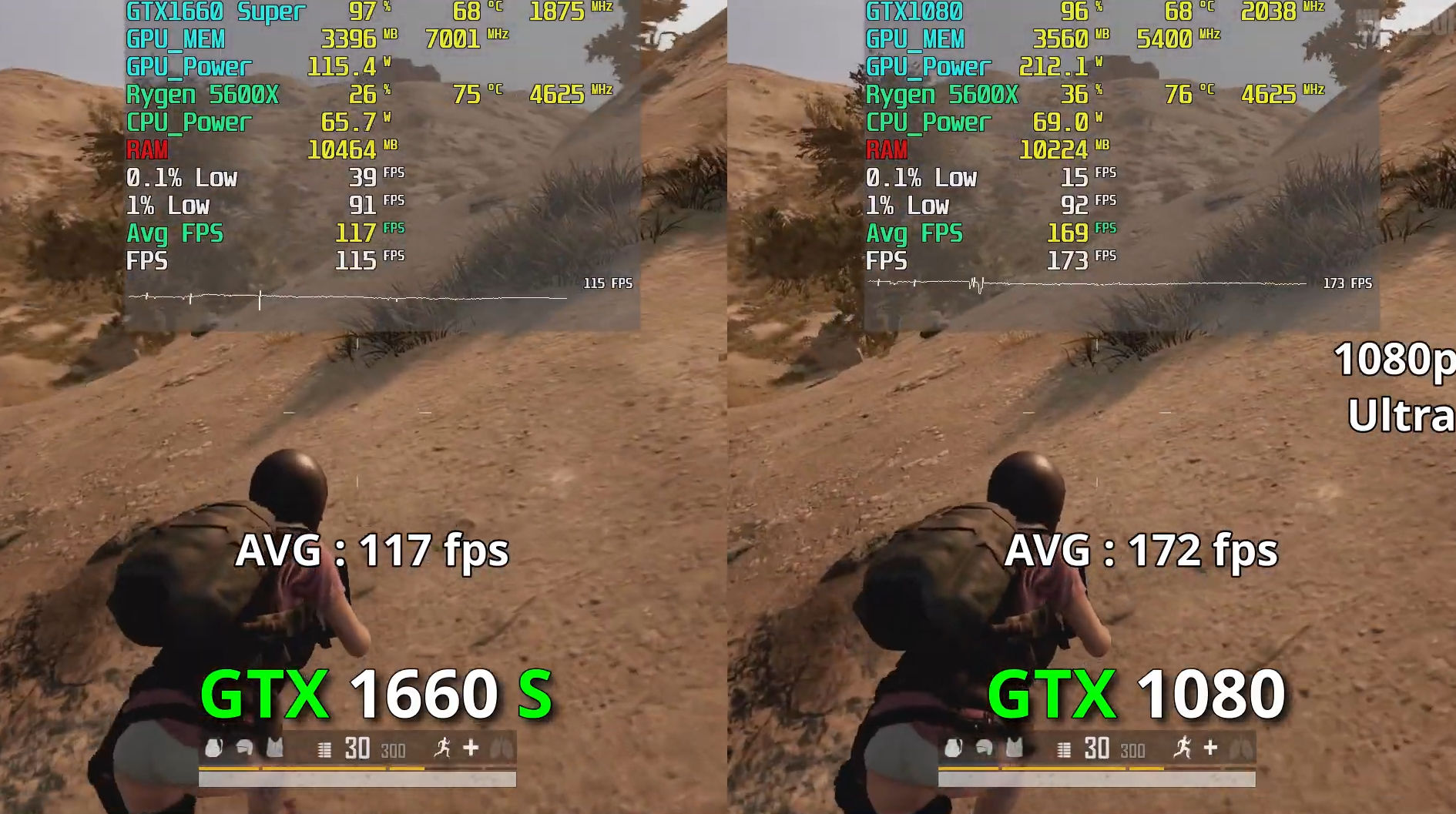 배틀그라운드 울트라에서 돌렸을 때 FHD 기준으로 각 평균 프레임은 117, 172로 GTX1080이 GTX1660 Super보다 약 47% 우세한 성능을 보여주었습니다.