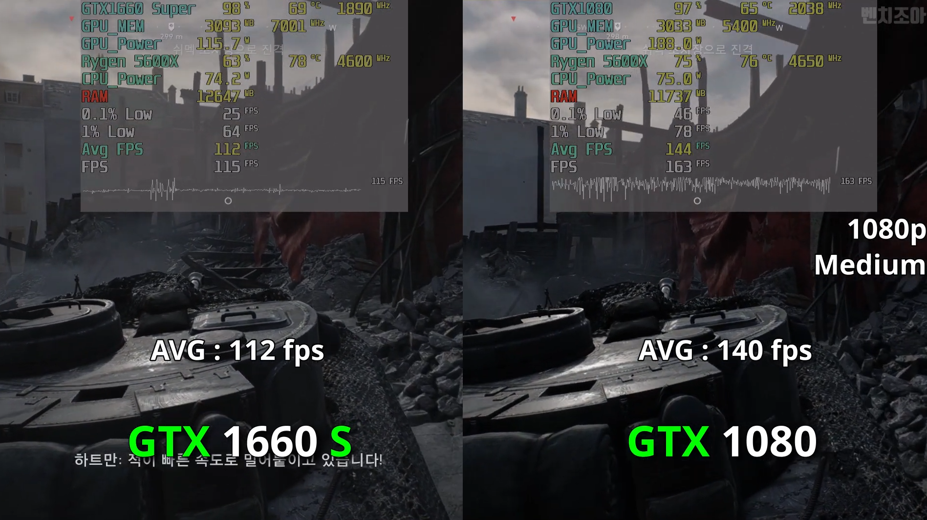 배틀필드 5 중간에서 돌렸을 때 FHD 기준으로 각 평균 프레임은 112, 140으로 GTX1080이 GTX1660 Super보다 약 25% 우세한 성능을 보여주었습니다.