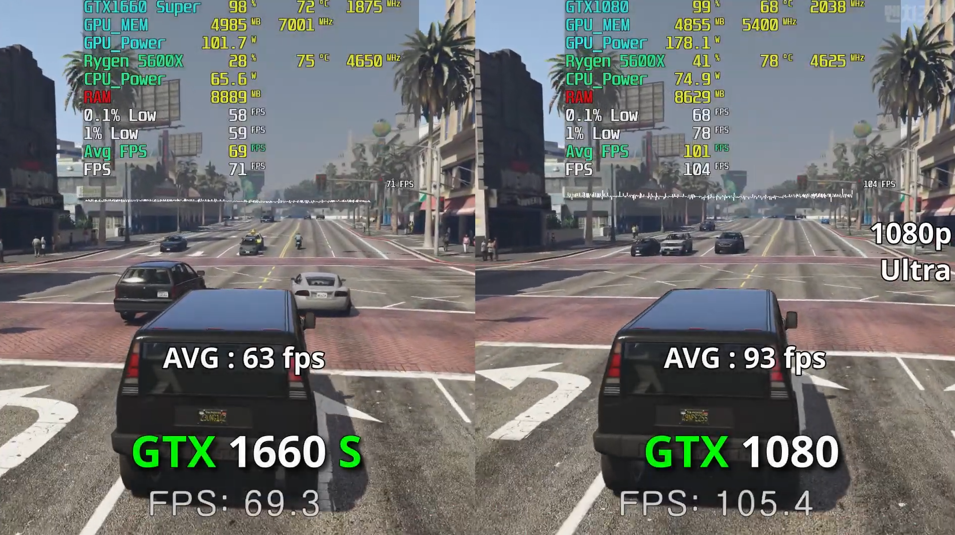GTA 5 울트라에서 돌렸을 때 FHD 기준으로 각 평균 프레임은 63, 93으로 GTX1080이 GTX1660 Super보다 약 47% 우세한 성능을 보여주었습니다.