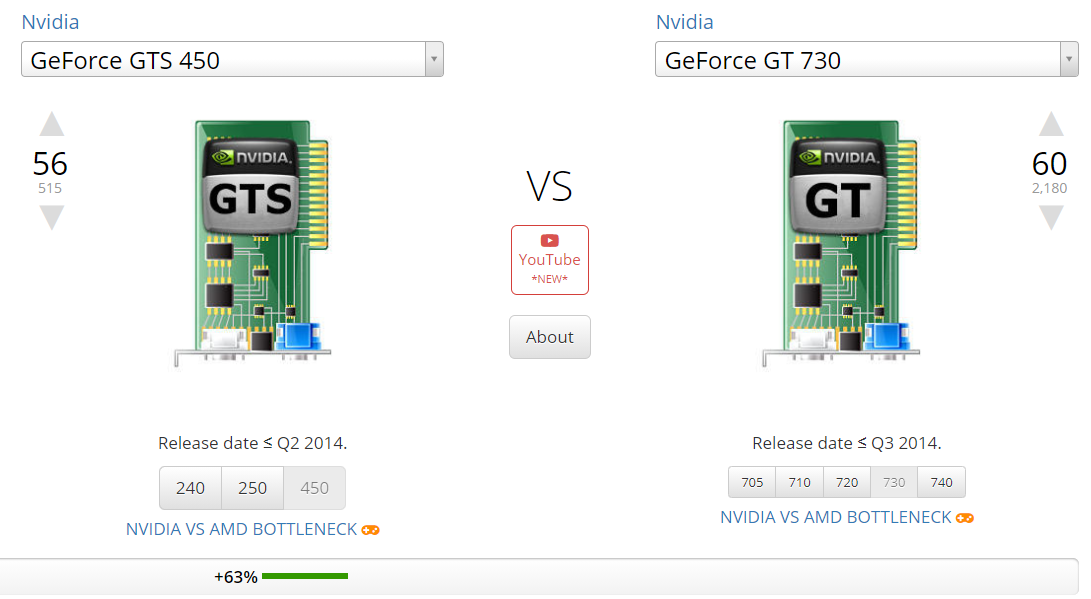 GT 730과 GTS450과 비교한 모습입니다. GT 730은 GTS 450보다 60퍼 정도 사양이 낮은 모습을 보여주었는데요, GTS 450은 10년 전에 출시한 그래픽카드로 자세한 사양은 아래의 글을 참고해 주시면 됩니다.