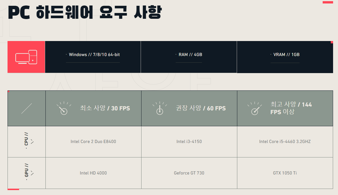 라이엇 측에서 발표한 공식 사양은 FHD 60hz 기준에서는 i3-4150과 GT 730, FHD 144hz 기준에서는 i5-4460과 GTX 1050 Ti를 쓴다면 쾌적하게 사용할 수 있다고 나와있습니다. 그렇다면 정말로 저 정도 사양이면 즐길 수 있을까요? 여러 영상들을 보며 확인해 보죠!